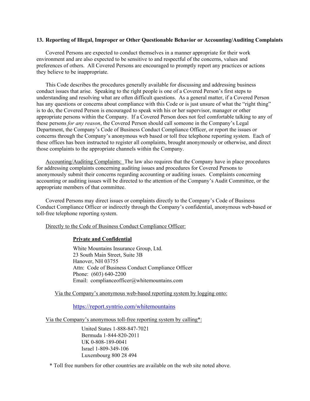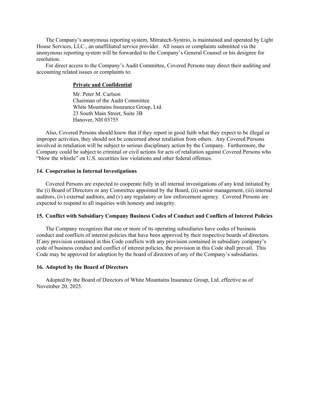 White Mountains Insurance Group, Ltd. (the “Company” or the “Registrant”) is an exempted Bermuda limited liability company whose principal businesses are conducted through its subsidiaries and affiliates. Within this report, the term “White Mountains” is used to refer to one or more entities within the consolidated organization, as the context requires. The Company’s headquarters is located at 26 Reid Street, Hamilton, Bermuda HM 11, its principal executive office is located at 23 South Main Street, Suite 3B, Hanover, New Hampshire 03755-2053 and its registered office is located at Clarendon House, 2 Church Street, Hamilton, Bermuda HM 11. The Company’s website is located at www.whitemountains.com. The information contained on White Mountains’s website is not incorporated by reference into, and is not a part of, this report.